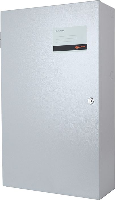 The Gallagher Dual Cabinet is a secure steel enclosure accommodating two full-footprint mounting plates, doubling the housing capacity for any combination of Gallagher PCBs. When the SMB Controller 6000 PCB is installed, optical tamper protection is provided for both the front and rear of the Cabinet.